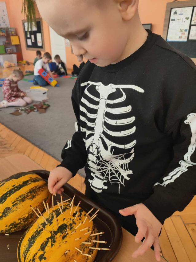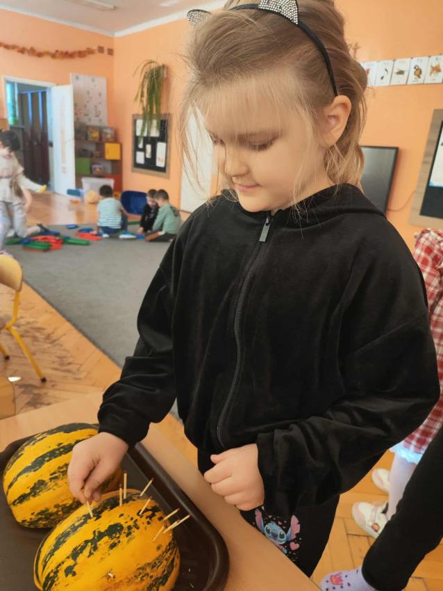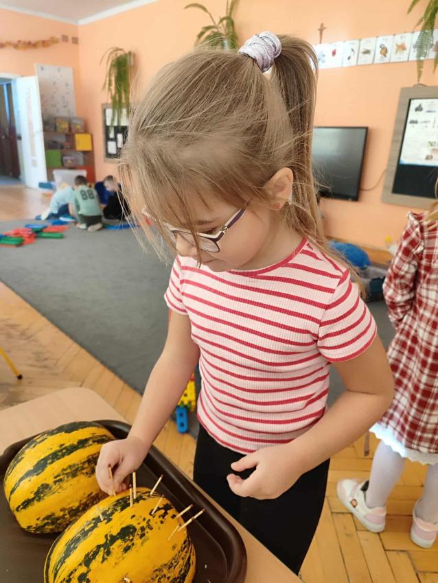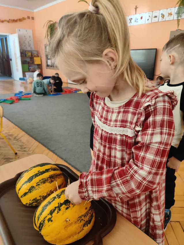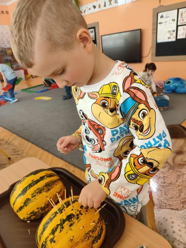Podczas pobytu w przedszkolu wykonaliśmy jeżyki na dyni wykorzystując przy tym zapałki.To popularna i kreatywna praca plastyczna. Dzieci delikatnie wbijały zapałki w skórę dyni, imitując kolce jeża. Czyż nie są urocze?
