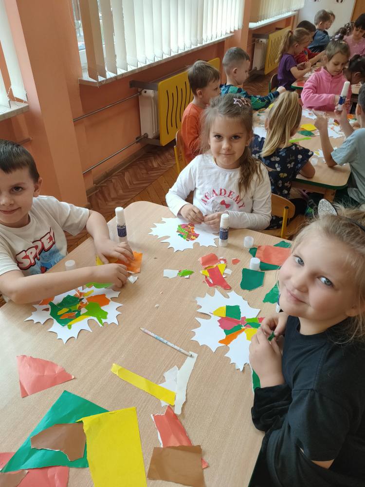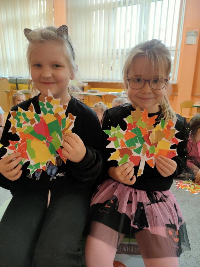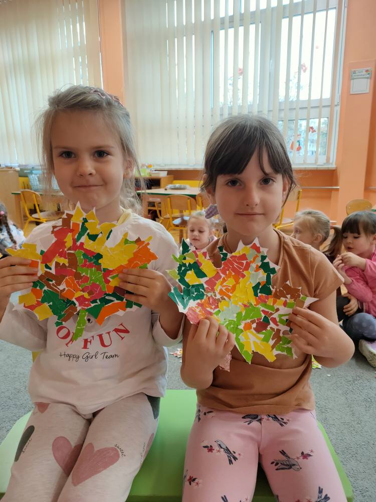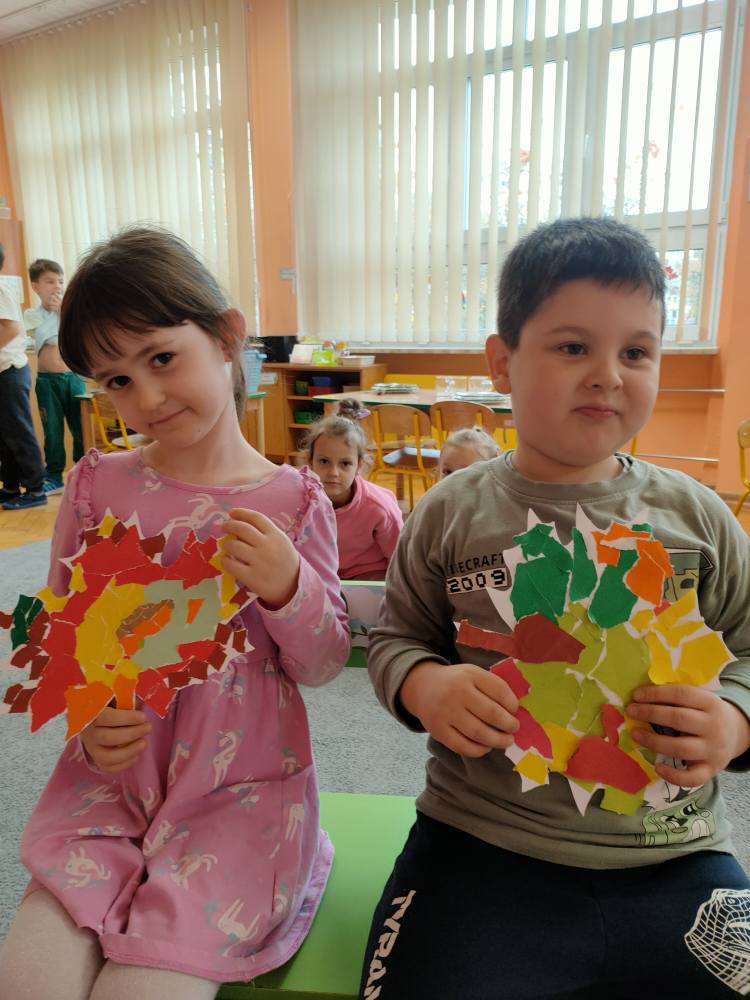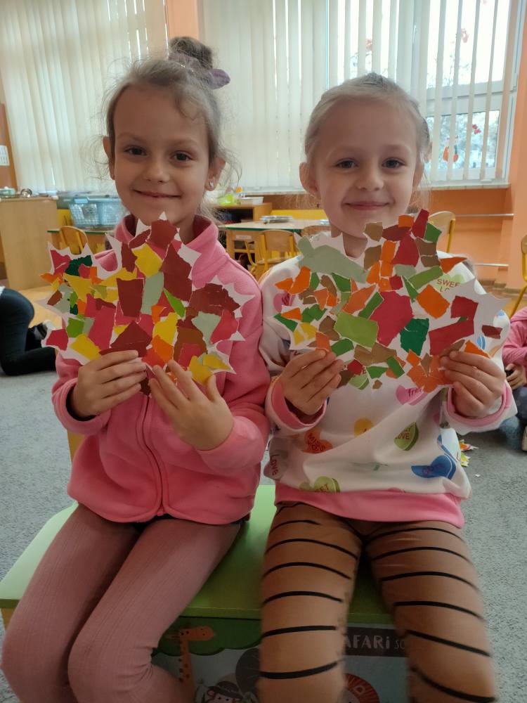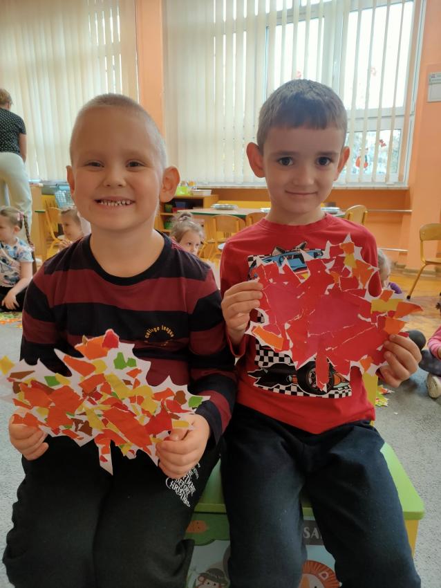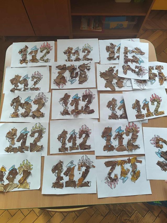 Podczas październikowych zajęć dzieci wyklejały szablon liścia kolorowymi papierami wycinankowymi w odcieniach jesieni, a także numer telefonu alarmowego wyklejany z liści