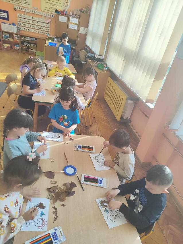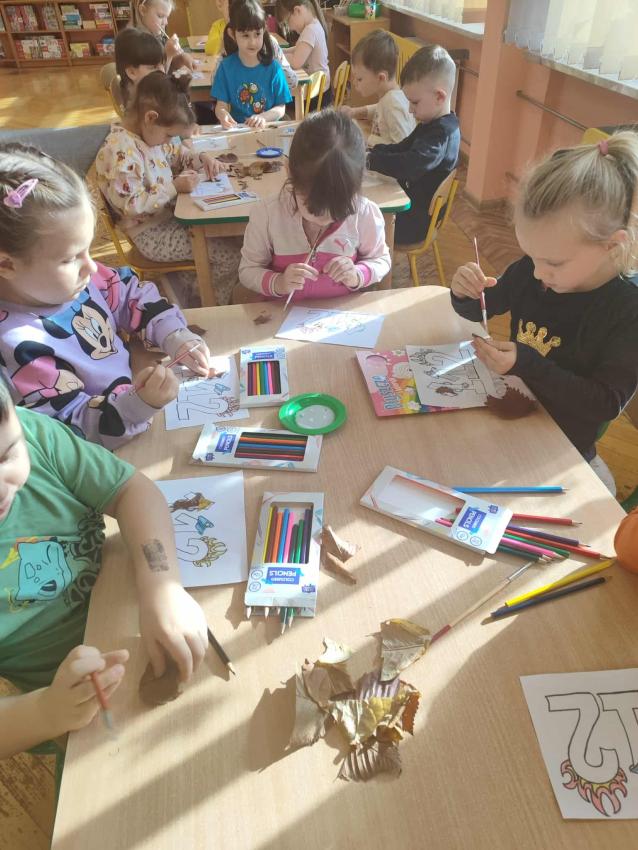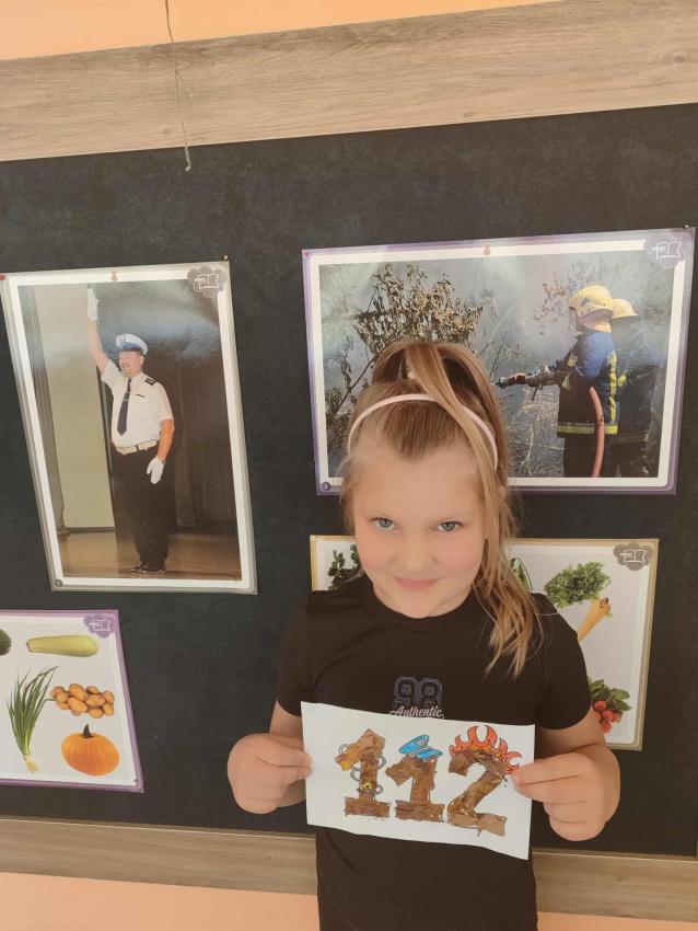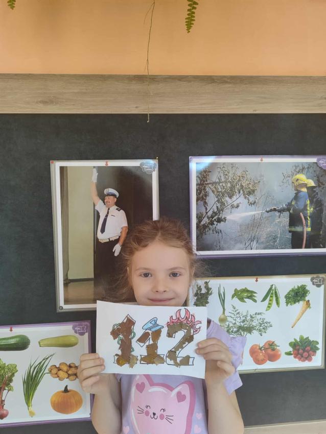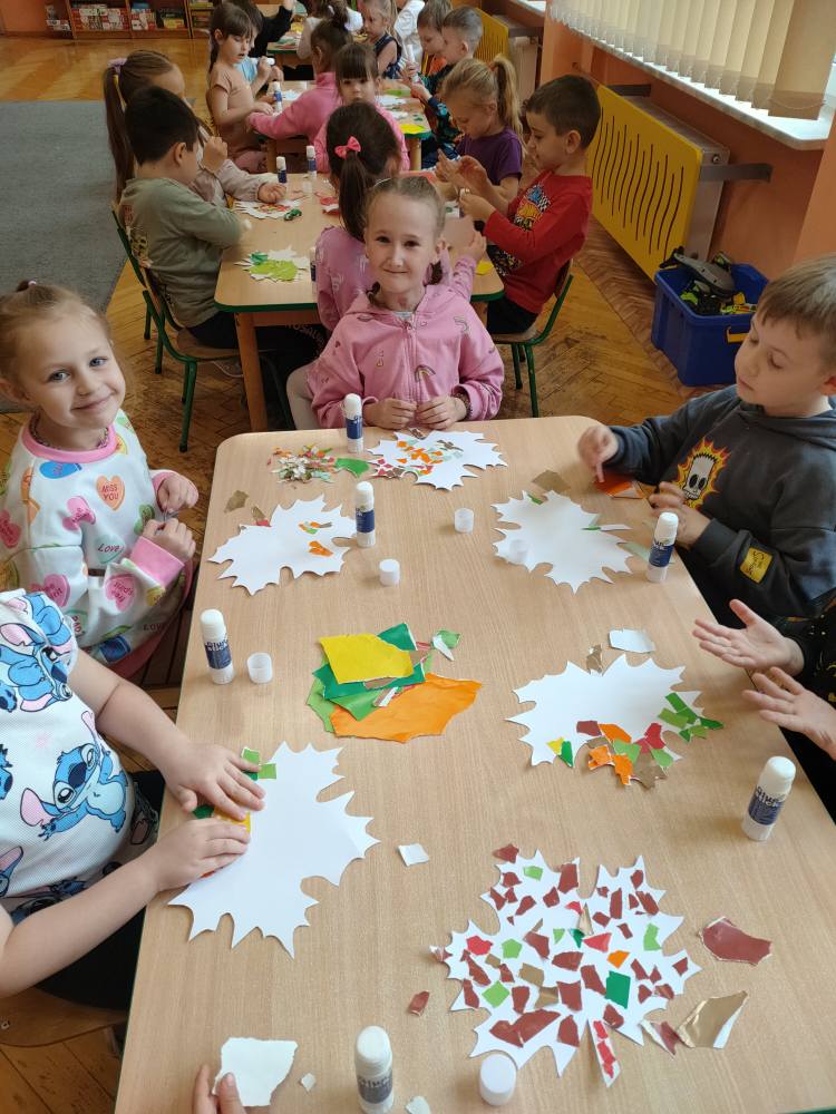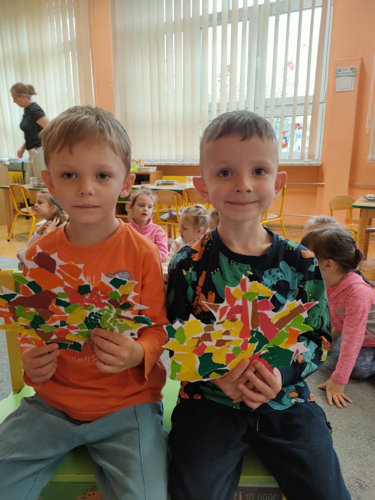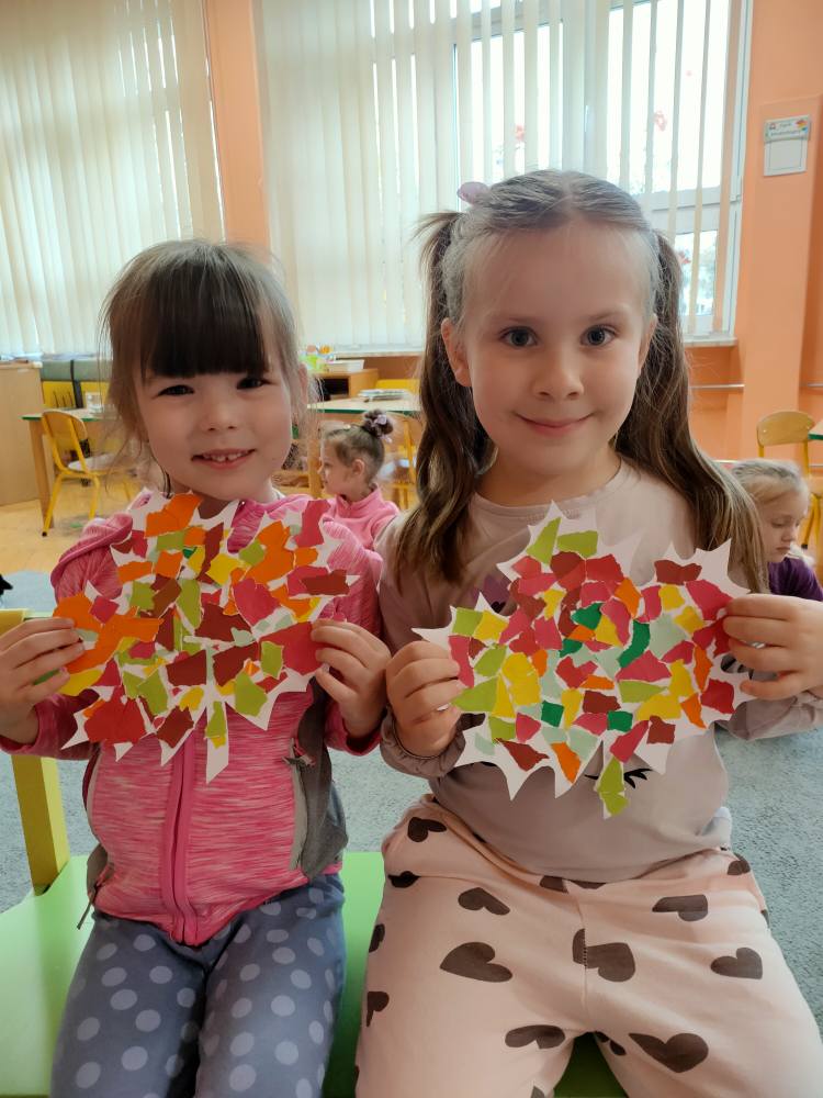 Podczas październikowych zajęć dzieci wyklejały szablon liścia kolorowymi papierami wycinankowymi w odcieniach jesieni, a także numer telefonu alarmowego wyklejany z liści