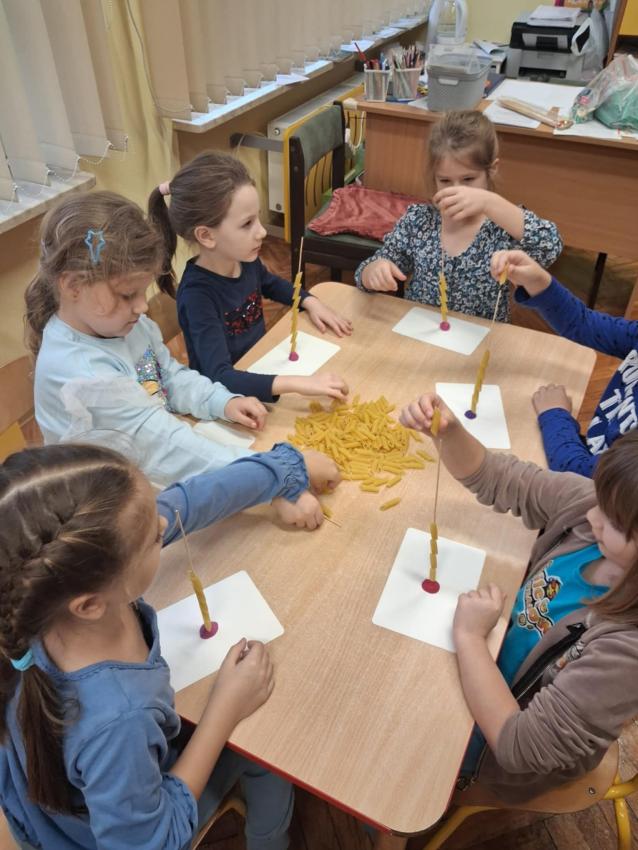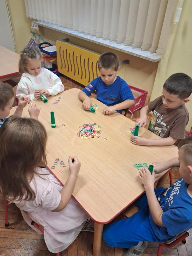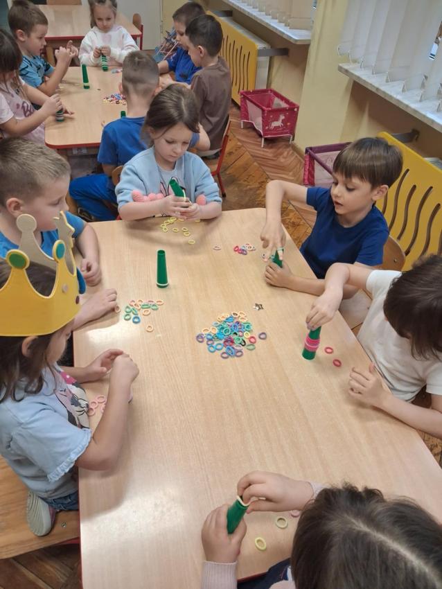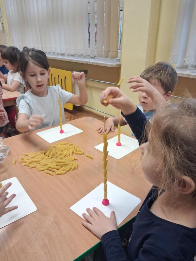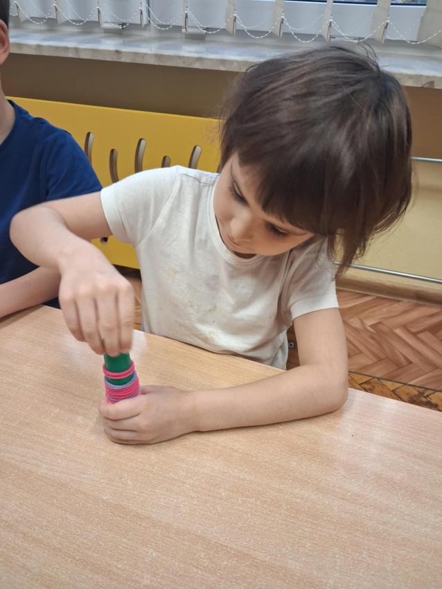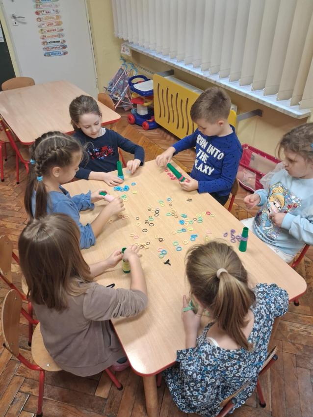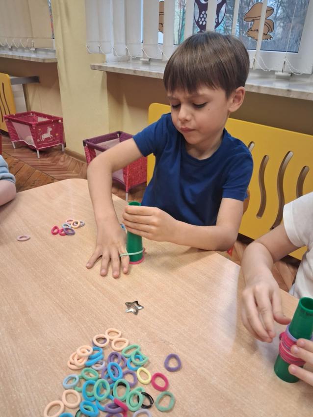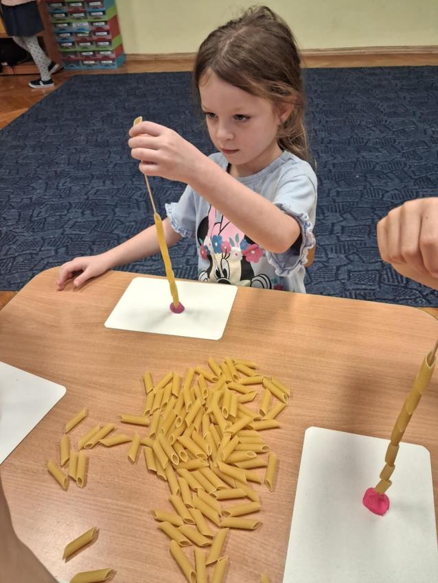 W listopadzie na zajęciach konstrukcyjno manipulacyjnych rozwijaliśmy motorykę małą . Nawlekaliśmy gumki na plastikowy stożek oraz makaron na wykałaczki. Te czynności usprawniają pracę palców i dłoni.