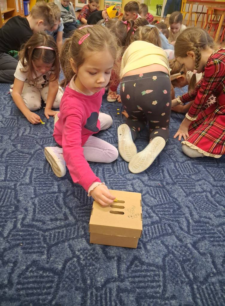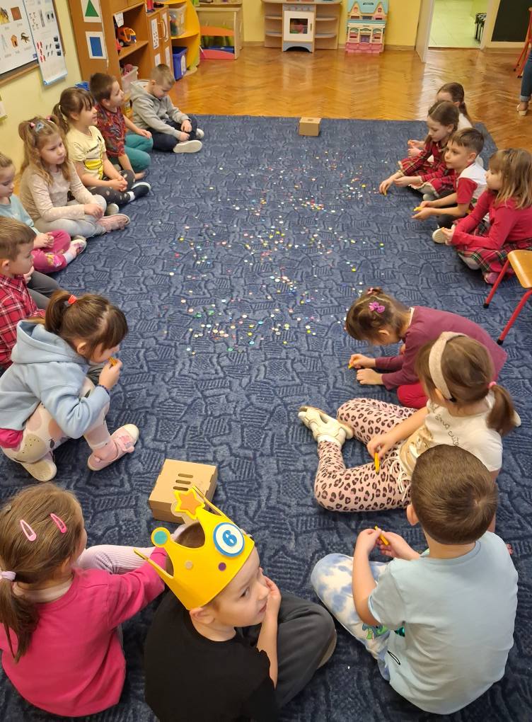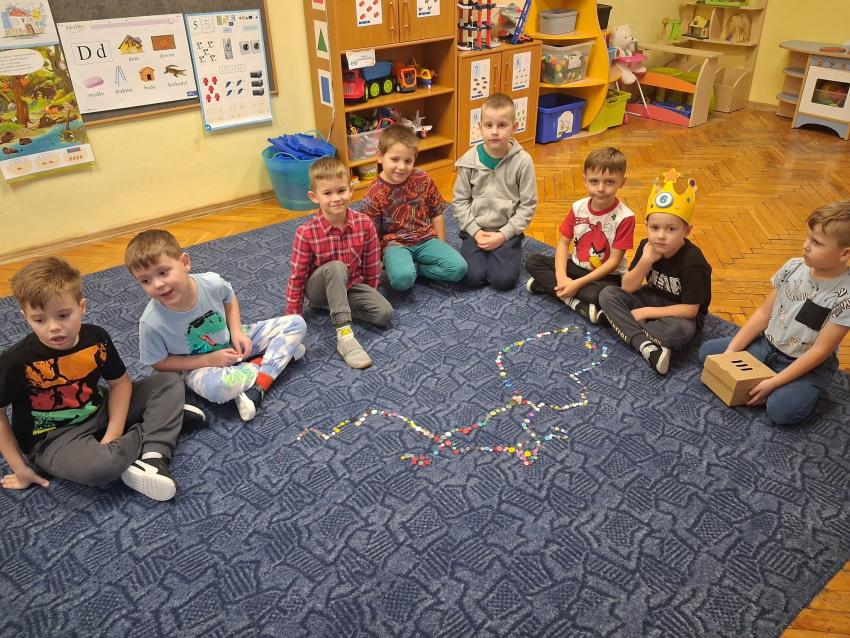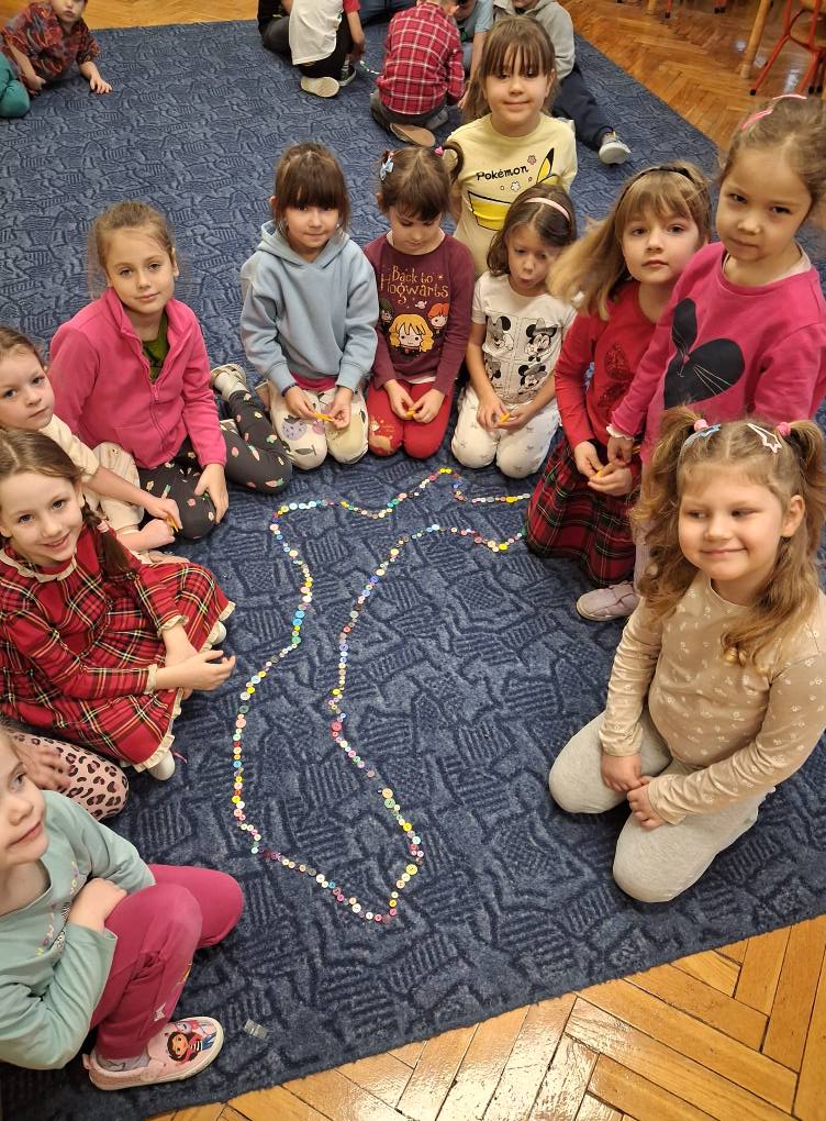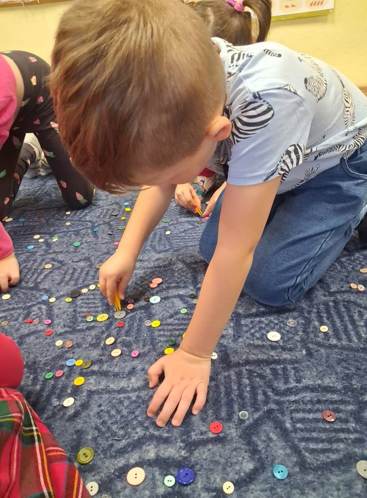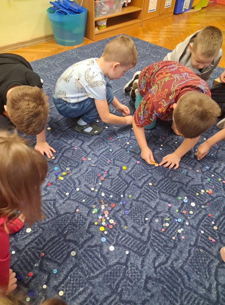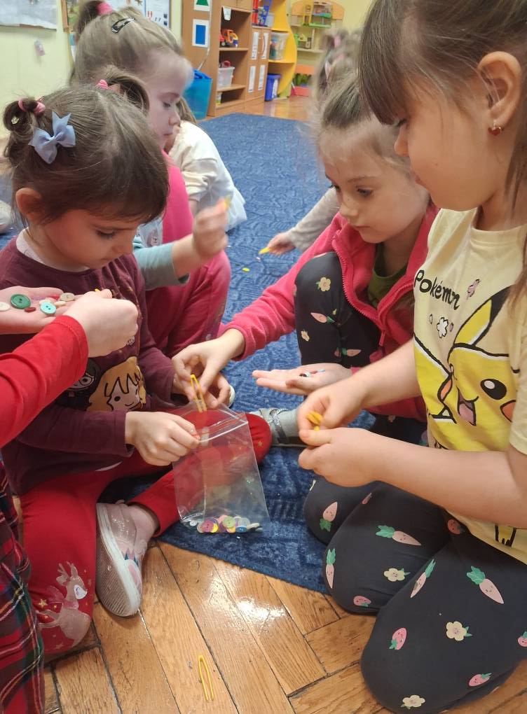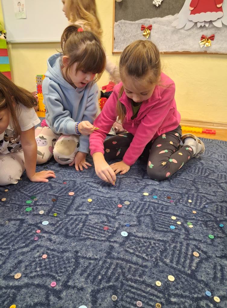 Dzień Guzika i guzikowe zabawy. Zbieranie pęsetą guzików małych i dużych to wyzwanie ale SÓWKI i z tym sobie wspaniale poradziły. Dzięki wspaniałej współpracy powstały również guzikowe węże.